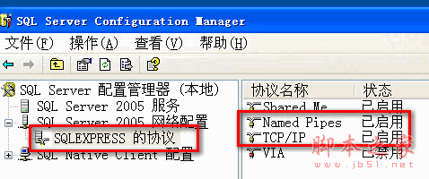 5、开启SQL Server 2005的网络协议TCP/IP和管道命名协议并重启网络服务。