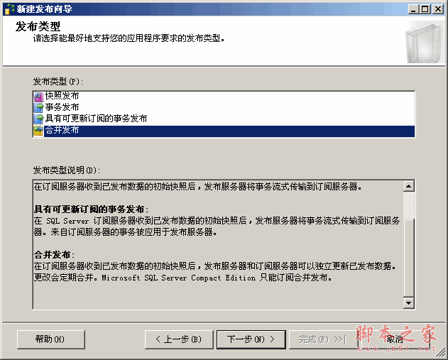 (2)接下来选择要发布的数据库,下一步,选择“发布类型”,我这里选择“合并发布”