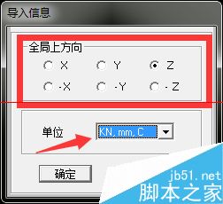 5、双击需要导入的文件后会弹出“导入信息”对话框,需要选择全局方向和单位,以上述图形为例,以为铁塔的延伸方向是沿Z轴向上的,所以勾线Z,单位以建筑的一般表示方法为准,采用毫米mm、千牛KN、摄氏度℃,设置完后点击“确定”