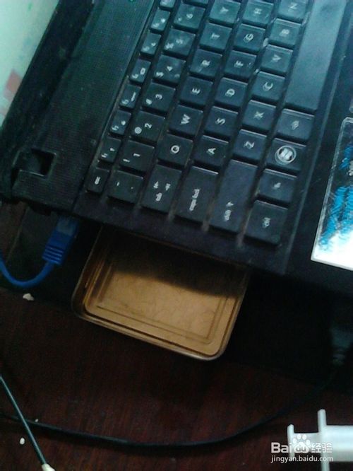 然后我们把折弯后的铁片垫在笔记本下面,注意垫的时候是弯折的部分朝下,也就是斜支在我们的桌面上。