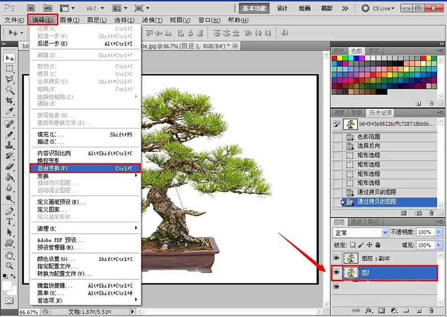 选中建立的第一个图层单击“编辑——自由变换(ctrl+t)”。