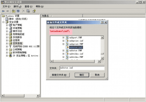 方法:开始―控制面板―管理工具―域安全策略―计算机配置―WINDOWS设置―安全设置―文件系统,单击右键――添加文件或文件夹。找到c:\windows\inf\usbstor.inf 和usbstor.pnf,并添加之