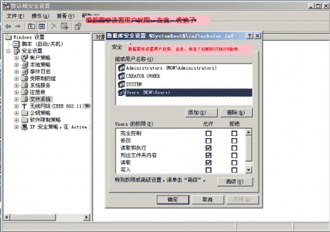 然后,确定,会弹出一个对话框,这可是重要步骤,通过此,设定不同用户对此的访问级别,当然,这里选拒绝了,你可以根据实际情况选择不同的用户组对这两个文件的拒绝权限。如下图: