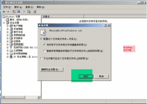 确定,OK,会弹出以下的窗口,当然,还是确定,不过,如果上一步你没有做的话,可以在此重新设定不同用户组的访问权限的哟(点编辑安全设置按钮)!确定,便可以了,等域组策略刷新后,就会生效了。