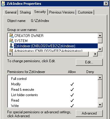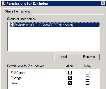 ④在B服务器上创建共享文件夹ZzkIndex并给ZzkIndexer帐户授予写权限,有两个权限需要设置,一个是文件系统权限,一个是共享权限。