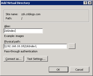 假设找找看的ASP.NET程序在A服务器,索引文件在B服务器的ZzkIndex共享文件夹中,访问地址是\\192.168.18.18\ZzkIndex\。要实现就是在A服务器的ASP.NET程序中能读写共享文件夹\\192.168.18.18\ZzkIndex\中的文件。