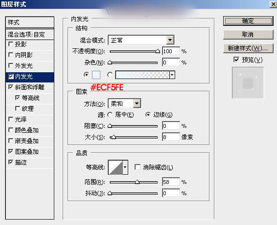 内发光:颜色为淡蓝色:#ecf5fe,其它设置如下图。
