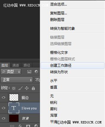 三、新建空白的“描边”图层,右键文字层,选择创建工作路径,然后隐藏文字图层。