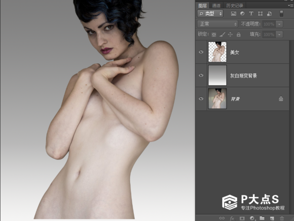 把美女抠出来之后在下面建个空白图层,然后拉个灰白渐变(素背景)