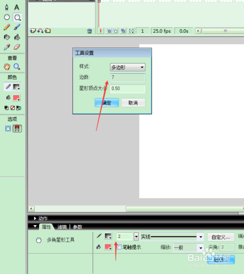 2、选择多边形工具,笔触与填充设置如图;