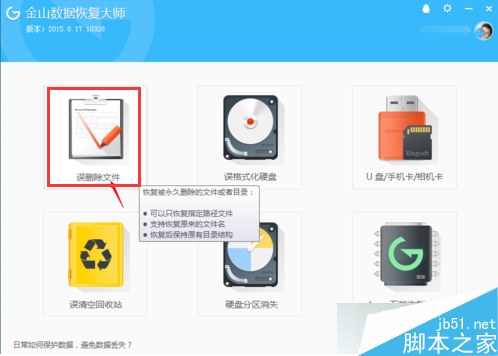 3、点击打开金山数据恢复大师,根据自己数据丢失的情况,选择具体的恢复类别,例如:误删除文件恢复;