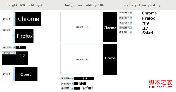 我对select的height、padding、line-height分别利用控制变量的方法写了个DEMO在各浏览器上测试三种情况:height.100.padding.0、height.no.padding.100、no.height.no.padding,结果如 链接图片各浏览器DEMO外观