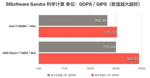 SISoftware Sandra算是比较老牌的CPU测试软件了,准确性还可以。它主要能够描述一款处理器的运算速度和指令执行速度。软件提供了两个参考单位一个是GOPS(数十亿运算/秒)GIPS(数十亿指令/秒)。在这项测试上,可以说锐龙 AMD Ryzen 7 1800X占尽优势,尤其是指令的执行上面似乎要比i7-6900K高效不少。