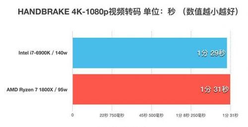 HANDBRAKE是国外一款非常常用的视频转码软件,虽然在国内不那么流行,但是其自带的计时功能能够很好的指示处理器的转码时间,作为测试非常合适。虽然AMD官方在做HANDBRAKE测试的时候,锐龙 AMD Ryzen 7 1800X对比i7-6900K是取得了完胜的佳绩的,但是从我测试的情况似乎不一定。我采用的视频源为4K分辨率2分钟长度,最终结果是1800X与6900K不分伯仲,1800X以2秒的微弱劣势告终。
