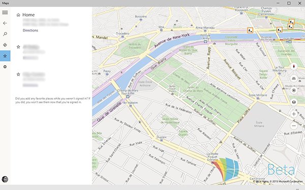 新Win10预览版的地图界面也进行了简化,设计更加简洁。你可以改变地图的视角和方向,找到“我的位置”,控制变焦。右边是一个侧边栏,让你可以访问搜索,收藏夹和设置。