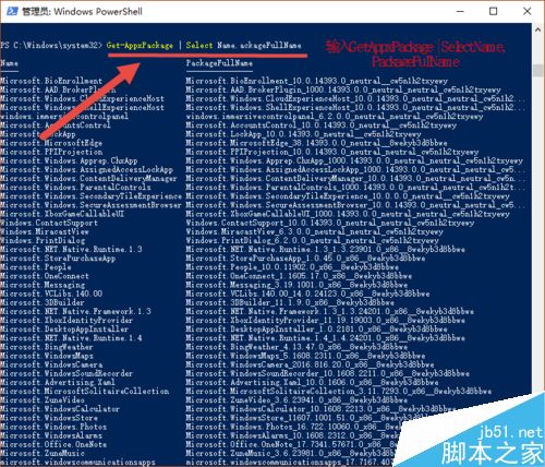 2、在打开的PowerShell窗口中输入“Get-AppxPackage | Select Name, PackageFullName”(注意空格和英文标点),查看已安装应用的清单。