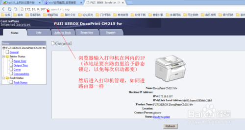 1、通过IP地址进入打印机管理界面(此处大量省略),强烈建议给予打印机和关联电脑静态IP以锁定,以免每次登录都会变。