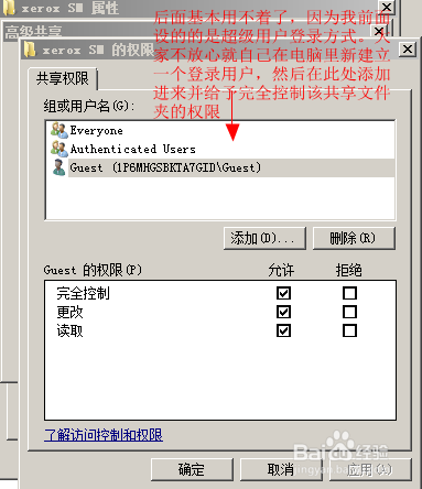 6、由于在第3步里我设置的打印机登录电脑时使用的是超级用户”administrator",所以这一步就不再重要了,如果亲设置的是电脑另一个非超级用户名,那么就要看看后面的7、8、9步了,点击“添加”继续