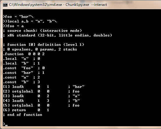 在这里,开头为[数字]的行是vm真正生成的字节码,我们看到一共生成了六行字节码。首先loadk将常量表中下标为1的常量即"bar"赋给寄存器0;然后setglobal将寄存器0的内容赋给全局变量表中下标为0的全局变量即foo;loadk再将"a"和"b"分别赋值给了寄存器0、1,在这里寄存器0和1分别表示当前函数的local变量即变量a和b;最后setglobal将变量a的值赋给了全局变量foo;最后一个return01是vm在每一个chunk最后都会生成了,并没有什么用。现在应该比较清除的了解了lua vm生成的字节码的含义了,接下来我们看看vm是怎样且为什么生成这些个字节码的。