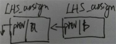 接下来将生成local a,b = "a","b"语句的字节码了。过程大致相同,不同的是a,b是local变量且这个赋值语句是多变量赋值语句,因此前面的函数会用LHS_assign链表将a,b变量连接起来。如图所示: