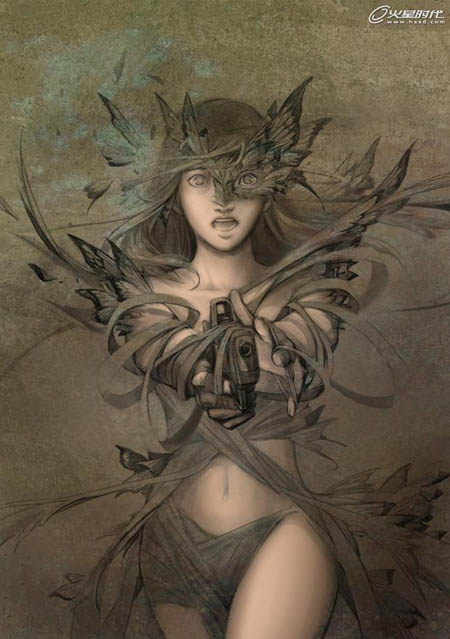 我更希望通过画面表现一种力量,一种对比,一种阵痛中的华美。所以在画面的主体上,我选择了一个女孩,她拿着一个类似枪的东西,缠绕着绷带,身上还有像蝴蝶羽翼一样的鳞片,脸上我给她加了一个像化装舞会戴的面具,而面具是由蝴蝶翅膀组成的。