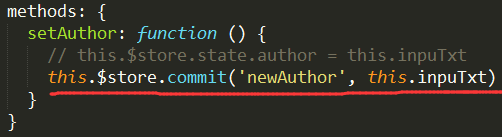 这里使用 $store.commit 提交 newAuthor,并将 this.inputTxt 传给 msg,从而修改 author