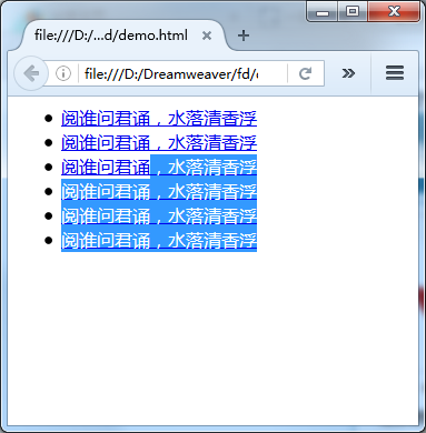 <html xmlns="http://www.w3.org/1999/xhtml"> <head> <meta http-equiv="Content-Type" content="text/html; charset=utf-8" /> <title></title> </head> <body oncontextmenu="return false" onselectstart="return false" oncopy="return false"> <ul> <li><a href="###">阅谁问君诵,水落清香浮</a></li> <li><a href="###">阅谁问君诵,水落清香浮</a></li> <li><a href="###">阅谁问君诵,水落清香浮</a></li> <li><a href="###">阅谁问君诵,水落清香浮</a></li> <li><a href="###">阅谁问君诵,水落清香浮</a></li> <li><a href="###">阅谁问君诵,水落清香浮</a></li> </ul> </body> </html>