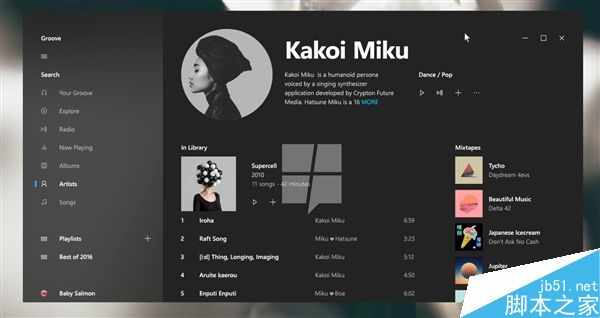 另外在Groove音乐中,背景模糊和应用内模糊也巧妙出现,如动图所示,歌手档案图的变化——