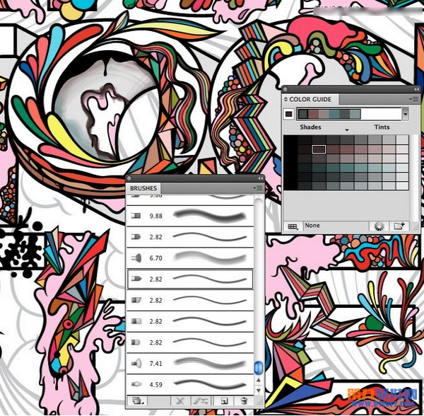 这就是我使用 Illustrator 中新增的“毛刷画笔”的地方。我想让 3D 深度形状变得柔和,因而使用“毛刷画笔”对这些色调上色。我发现我可以创建自然的液体画笔描边,这种描边看起来像传统媒介,如水彩或油漆。我尝试了很多种画笔形状,例如扇形画笔和圆点画笔。