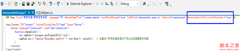 我说一个现象大家一定常见 ,就是在网页中删除一些东西的时候滚动条往往还在删除东西之前的位置,而不是非常不人性化的跑到那一页的顶部,那么这是怎么实现的呢?其实办法很简单,只需要在.aspx的源码中的顶端部分加上 MaintainScrollPositionOnPostback ="true"即可。见下图: