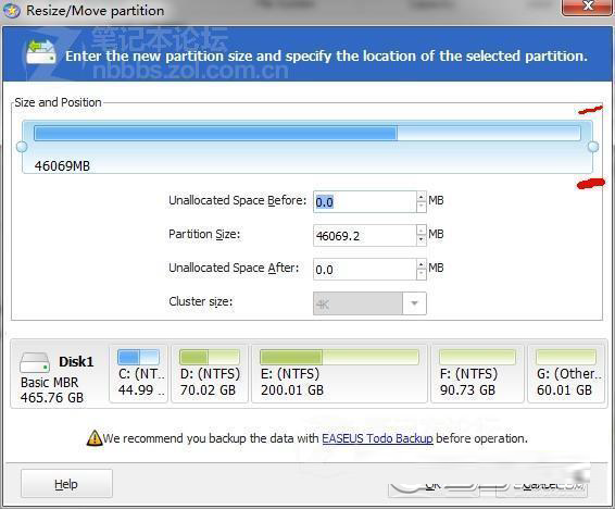 拖动上面的硬盘容量进度条,如果感觉到不精确,还是输入数字把,扩容的容量就非常精确了,不过输入数字时,有时你发现输入的分区是没有用的,先把剩余的D盘容量确定好吧!也是剩下分区吧!