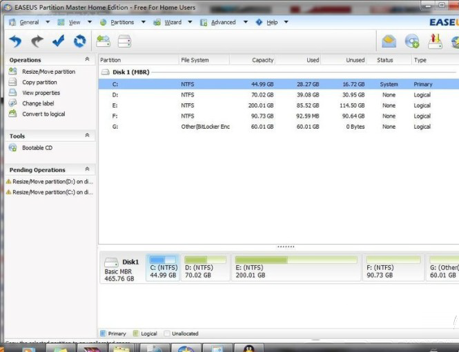 完美进入系统,C 盘容量扩容成功,变成了45GB.呵呵!石头落地了把!