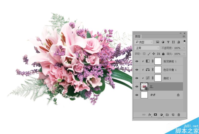 花朵在白色背景上显得稍微暗淡,我用曲线提高它的亮度;同时还用了色彩平衡,增加了它的暖色;最后我使用了渐变映射再让它的色彩过渡更自然。