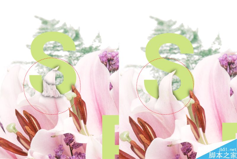 为了看清两个图层之间的遮挡关系,我们稍降低文字的透明度。从"S"这个字母开始,放大细节,我用白色画笔涂抹了三个部分,这三个部分让S上方的花朵显露了出来。记得,白色画笔是画在最上面花朵图层的黑色蒙板上。