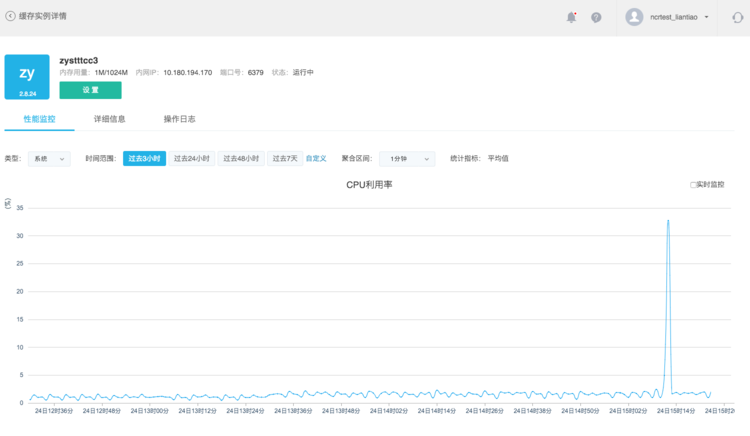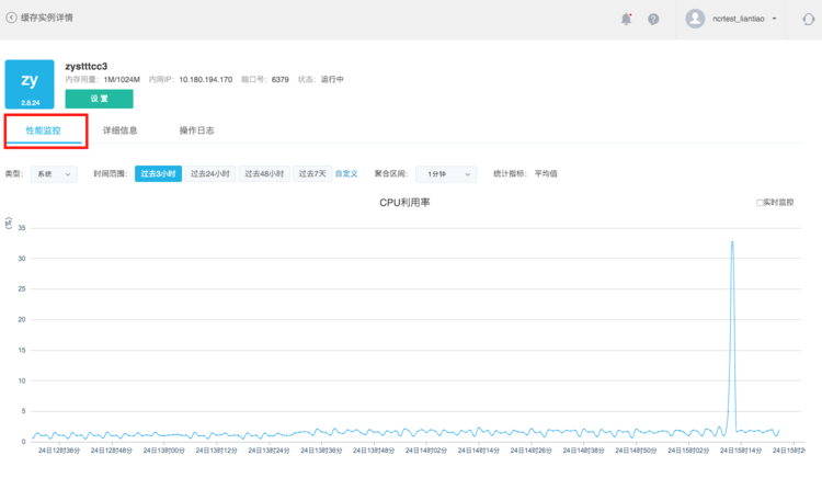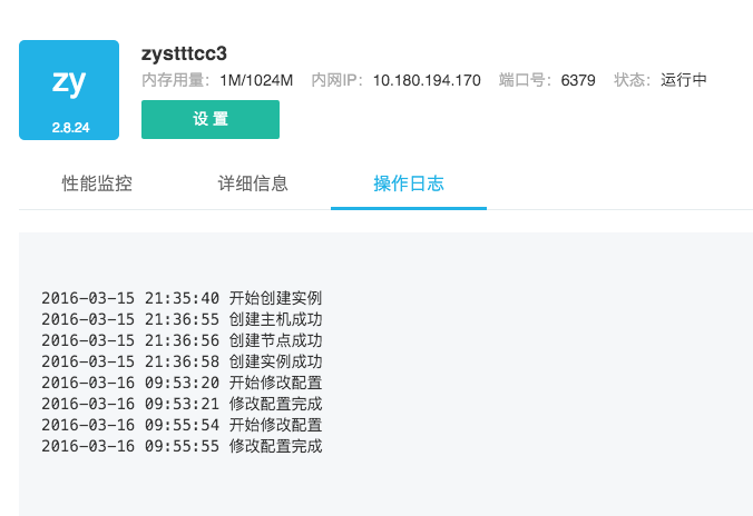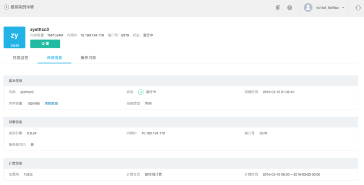 在「缓存服务」主界面,点击该实例名称,进入缓存实例详情页面。这里包含了「性能监控」、「详细信息」和「操作日志」功能,并提供「设置」按钮。