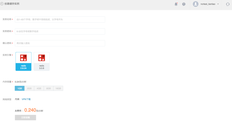 你可以在「缓存服务」主界面,点击「创建缓存实例」来创建一个新的缓存实例,创建实例界面如下所示,操作十分便捷,只需填写实例名称、实例密码,选择实例引擎和实例内存容量,然后点击「立即创建」按钮,即可开始创建实例。