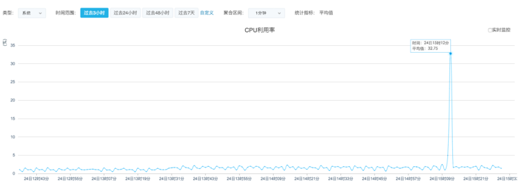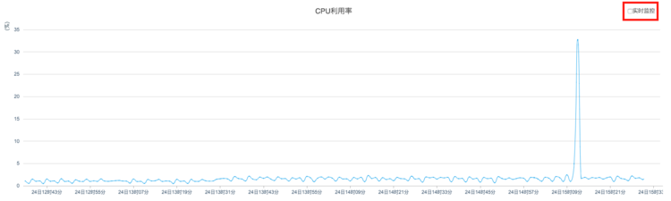 若通过快捷键设定时间范围为「过去 3 小时」或「过去 24 小时」,我们提供实时监控功能。勾选/取消勾选 各性能监控数据曲线图右上角的「实时监控」,即可 开启/关闭 监控数据实时刷新。