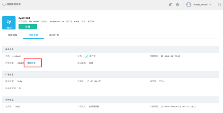 基本信息版块「内存容量」右方,提供「清除数据」功能,您可以通过该按钮清空实例内存。