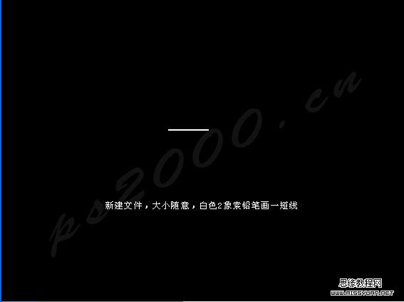 1、新建一个500 * 500像素的文件,背景填充黑色,然后新建一个图层,选择铅笔工具,大小为2像素,在画布中心画一条短线,如下图。