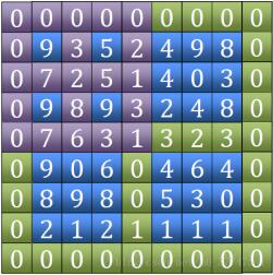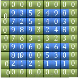 1、找“田”字。包括外围的四条边和中间横竖两条边(图中绿色部分),比较其大小,找到最大值的位置。(图中的7)