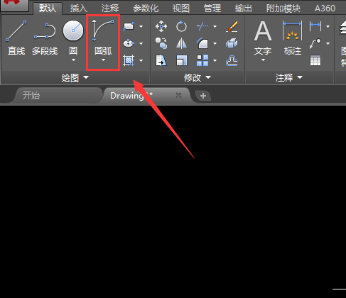 6、再在菜单区里找到圆弧命令,如图所示: