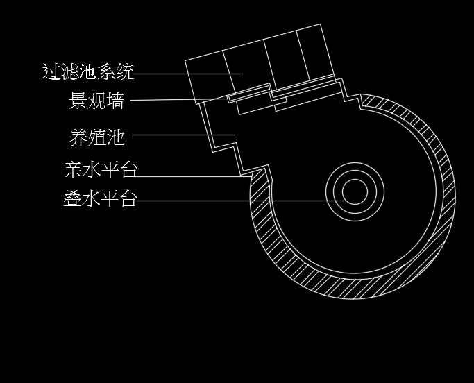 13、使用文字命令,在图形上标注出鱼池各部分的用途这样我们的鱼池就画好了,如图所示: