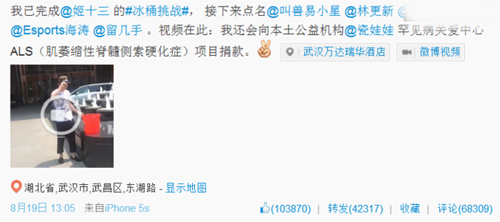 除了iPhone6这种全球性的热点,引发全网关注的冰桶挑战活动,又怎么可以错过,4万多转发哦,看着高高在上的首富被冰水淋头,粉丝有说不出的好奇感。