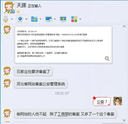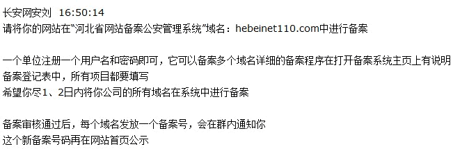 据读者大街上晒月亮爆料:河北也要求备案公安管理系统了,他所在的单位刚刚收到收到我们辖区的来电,要求在1、2日内将公司所有域名在系统中进行备案。