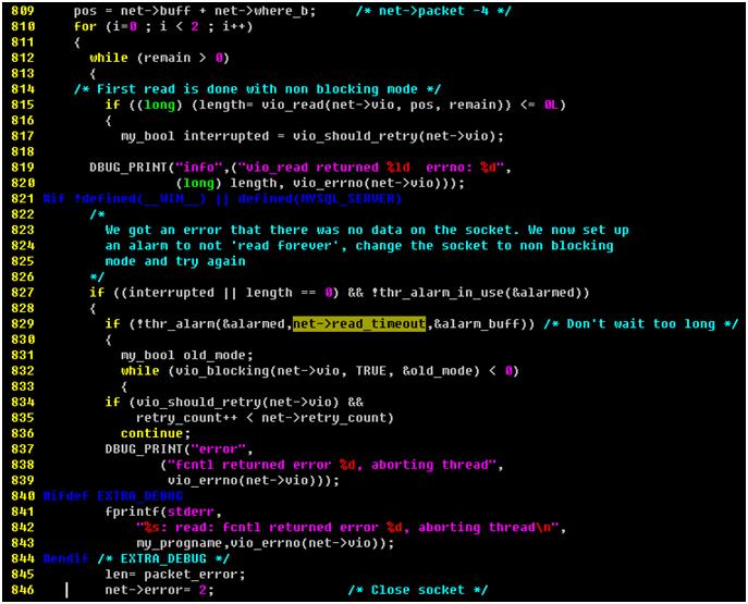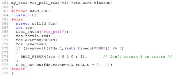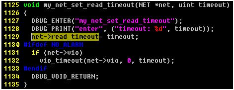 如果需要修改这个秒级别的超时,比如改成毫秒级别的超时,只能两个地方修改: 1. 修改客户端,比如 mysqli 的 query 代码,加入定时器,超时则返回 2. 修改 Mysql 中的vio代码,因为mysql的网络处理底层都是经过vio的操作