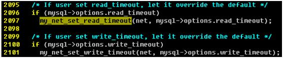 现在我们来看看如果我们自己要设置超时,我们自己压入 MYSQL_OPT_READ_TIMEOUT 也是可以达到读写超时效果的,写一段代码来测试一下: