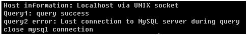 按照上面查看代码来看,目前PHP针对MySQL查询超时以下限制: 1. 超时设置单位为秒,最少配置1秒 2. 但mysql底层的read会重试两次,所以实际会是 3 秒 重试两次 + 自身一次 = 3倍超时时间。 那么就是说最少超时时间是3秒,不会低于这个值,对于大部分应用来说可以接受,但是对于小部分应用需要优化。 查看上面代码的执行结果,验证了上面的观点,第一个查询成功了,第二个查询连接被断开了:
