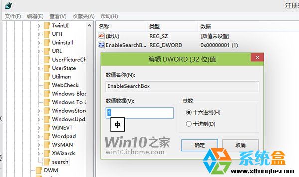 3、创建一个新的DWORD值,命名EnableSearchBox并且设置键值为1。如果目前存在这个键值,将其值由0改为1