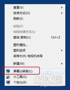 一 在电脑桌面空白地方鼠标右键,在弹出菜单列表里选择(屏幕分辨率)。