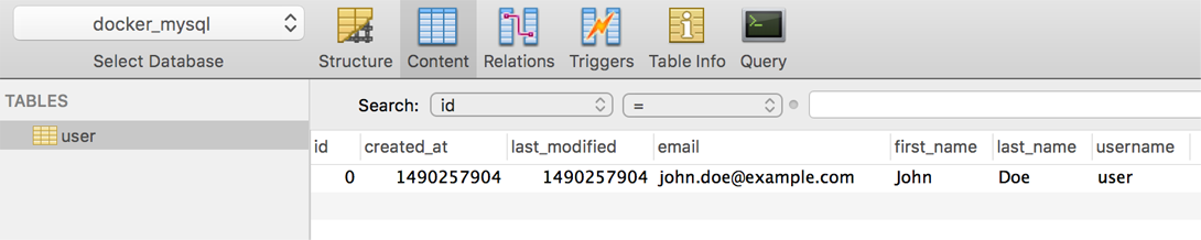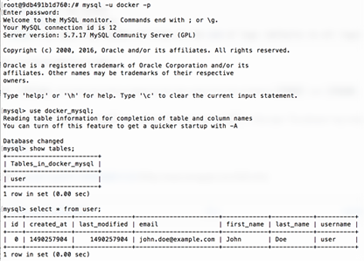 前文中创建了docker_mysql数据库,并在此数据库中创建了user表,同时将数据库的连接授权赋予了新建的docker用户,因此验证过程为: